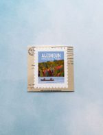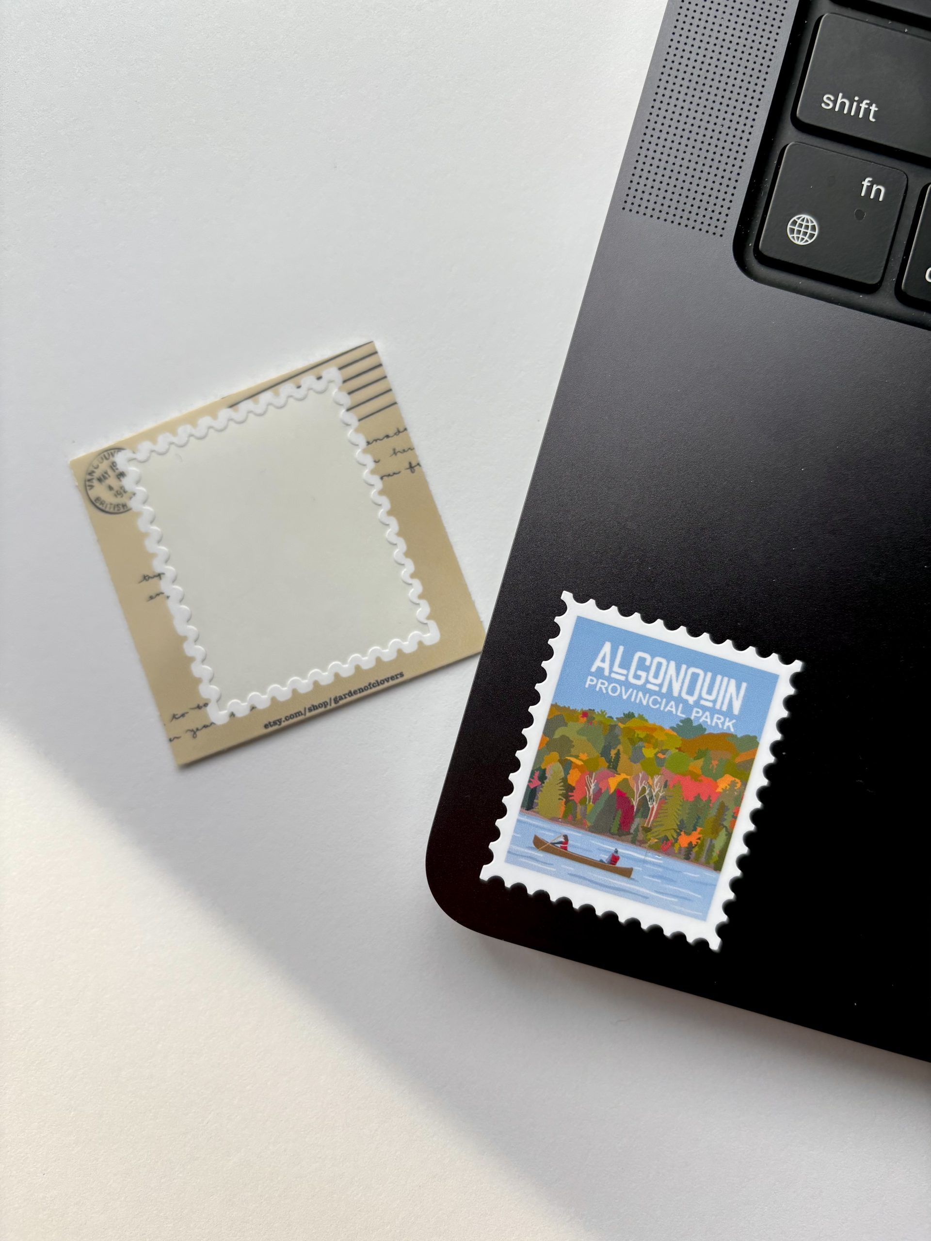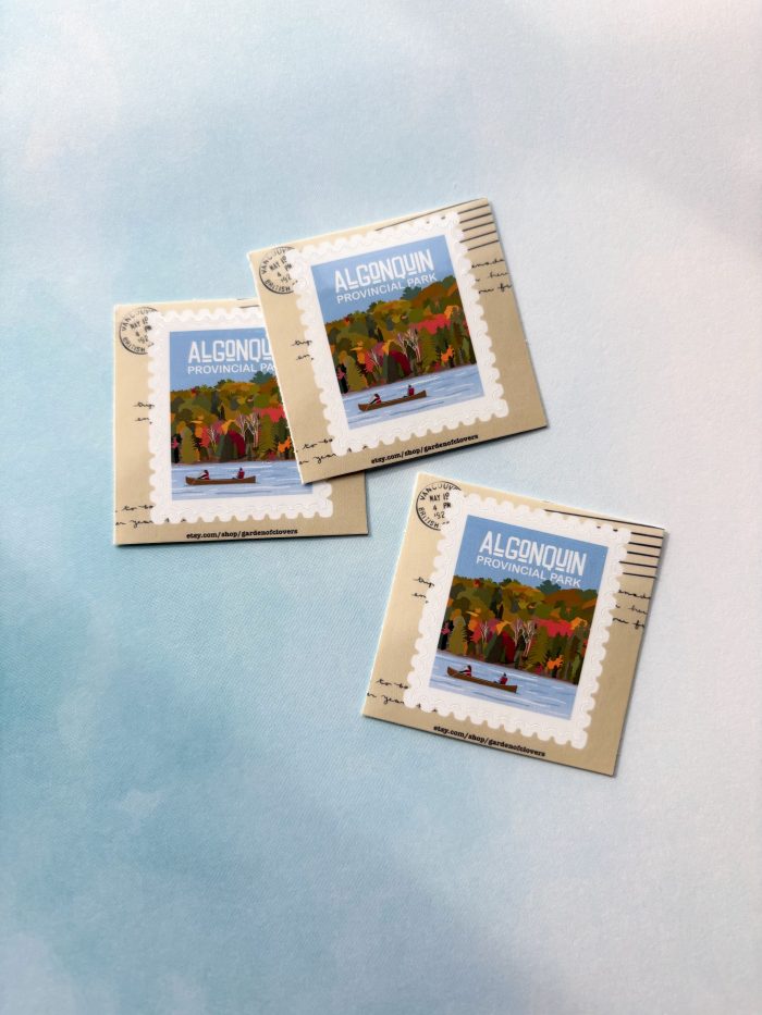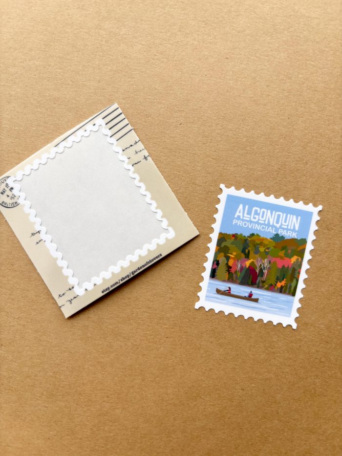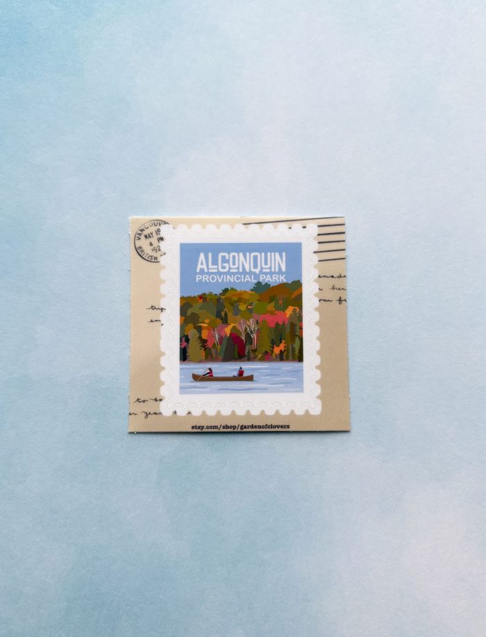 Designed in a vintage-inspired stamp shape, this sticker captures a peaceful fall scene featuring vibrant autumn leaves and a couple canoeing through the iconic lakes of Algonquin.