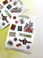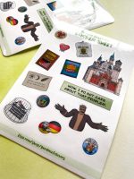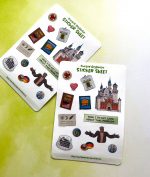 A handmade sticker sheet inspired by an old computer game featuring a mystery in Germany. There are 13 stickers total: