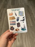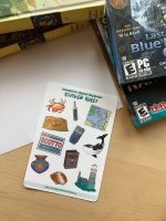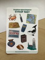 A handmade sticker sheet inspired by an old computer game featuring a mystery on deception island. There are 11 stickers total: