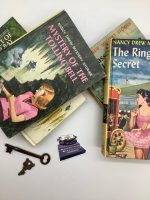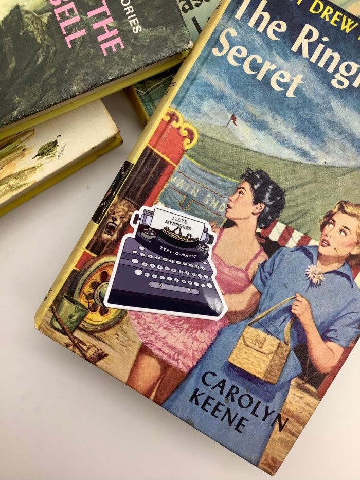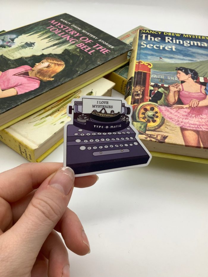 This is a handmade sticker! It features an illustrated typewriter that says “I LOVE MYSTERIES”. This is the gray variation – please note I also have a pink variation for sale for this design. They measure 5cm in height and 5.5cm in width.