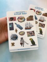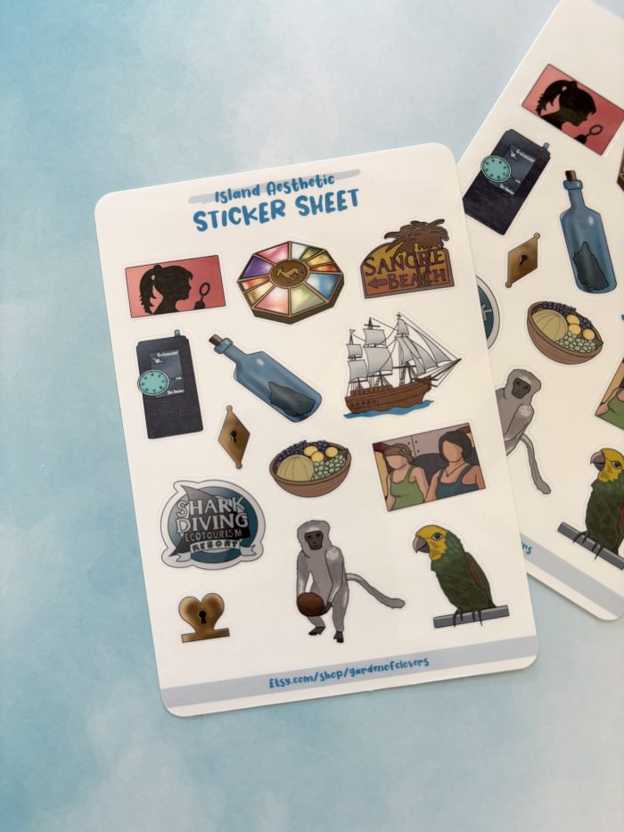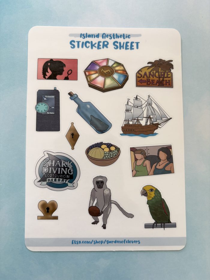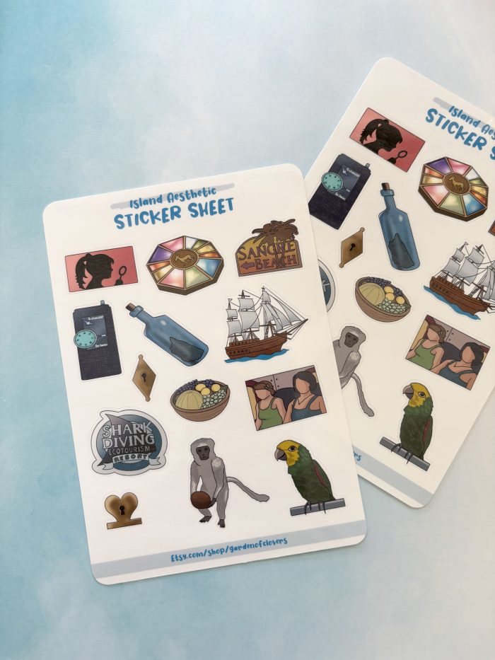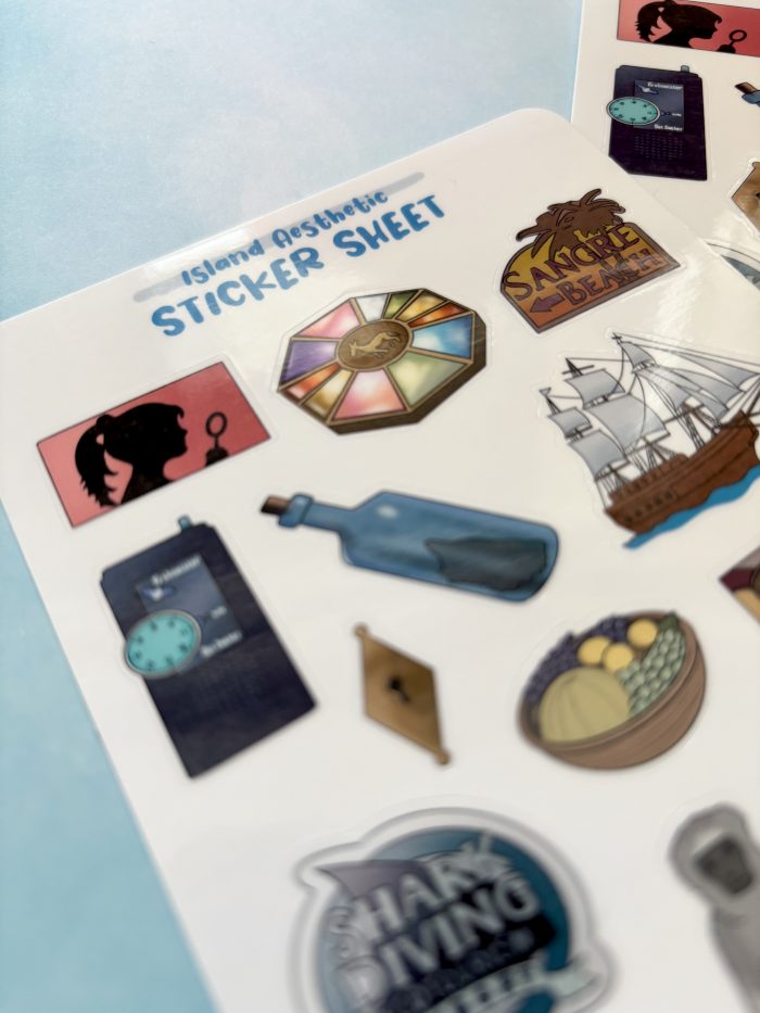 A handmade sticker sheet inspired by a computer game featuring a mystery on an island vacation. There are 13 stickers total: