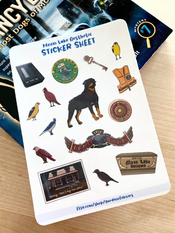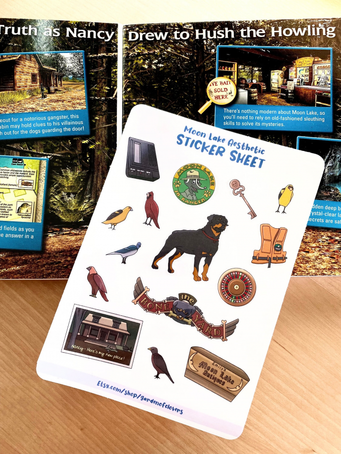 A handmade sticker sheet inspired by an old computer game featuring a mystery at moon lake. There are 15 stickers total: