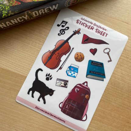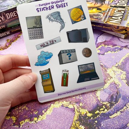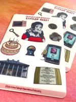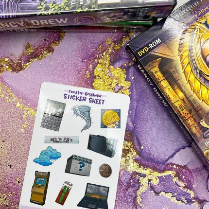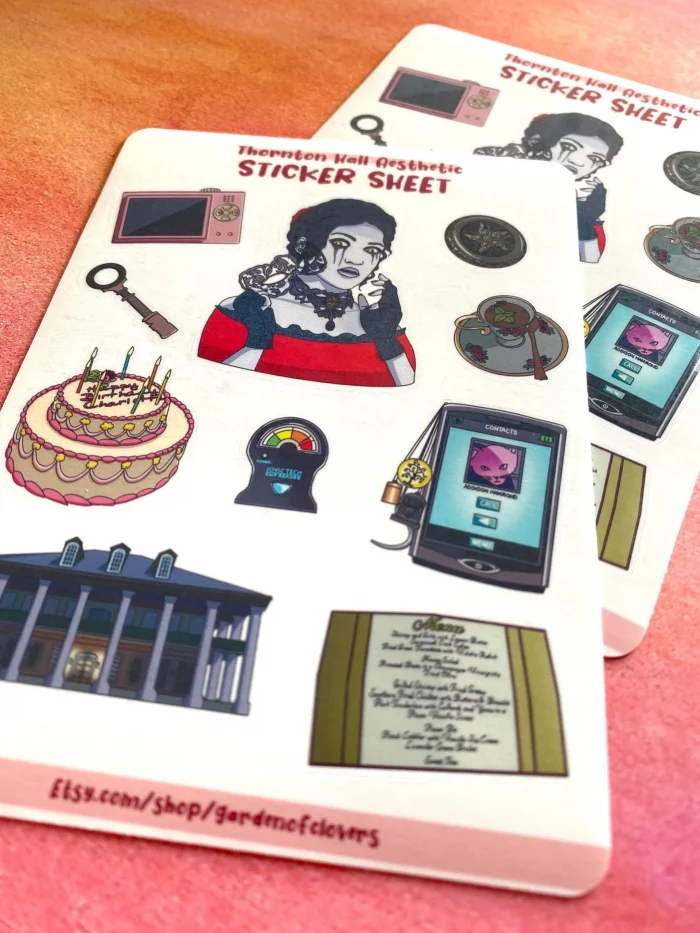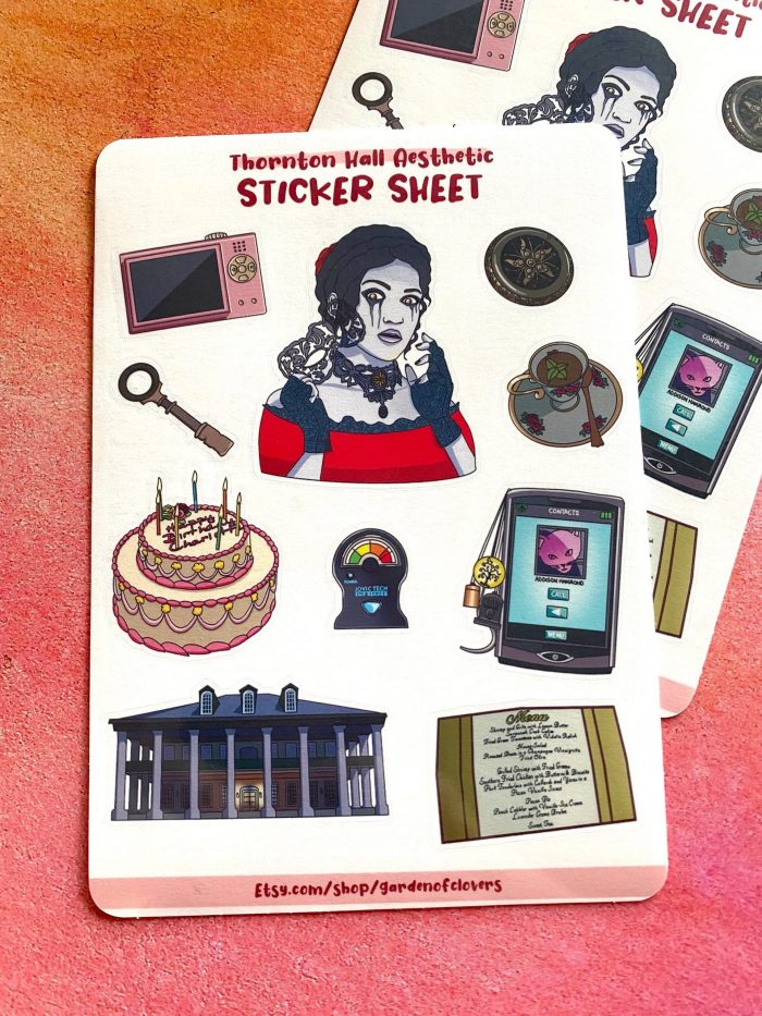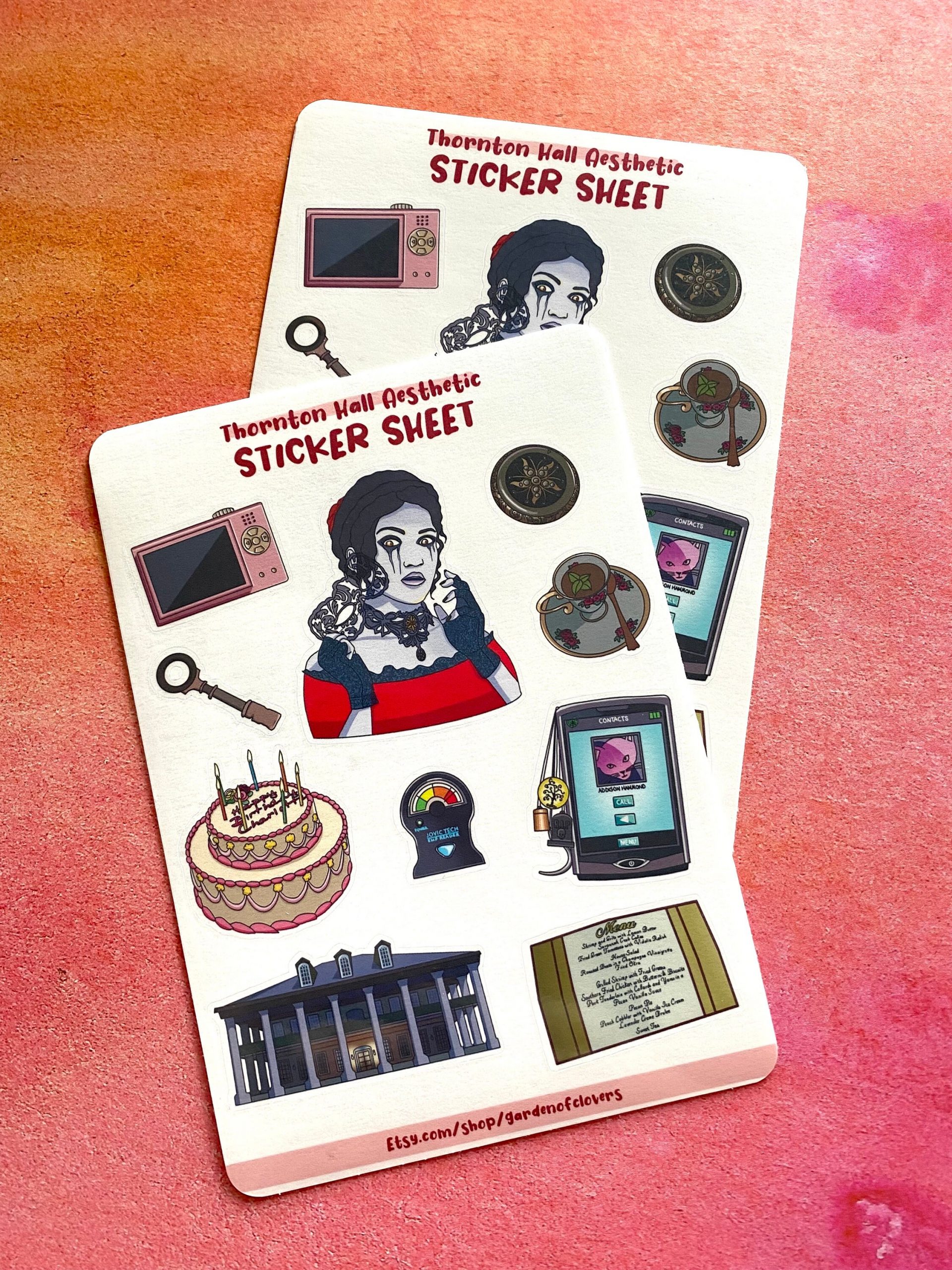 A handmade sticker sheet inspired by an old computer game featuring a mystery at Thornton Hall. There are 10 stickers total: