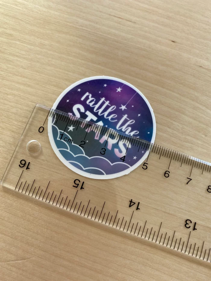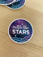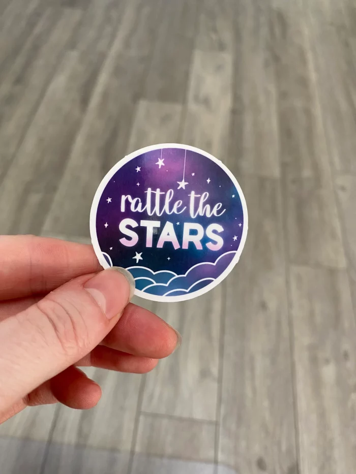 A hand drawn vinyl sticker with the quote “rattle the stars” from the Throne of Glass series. It is glossy and good quality but not waterproof.