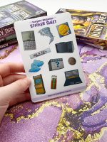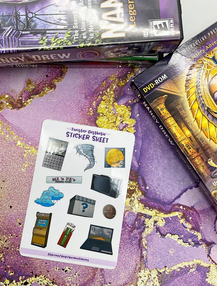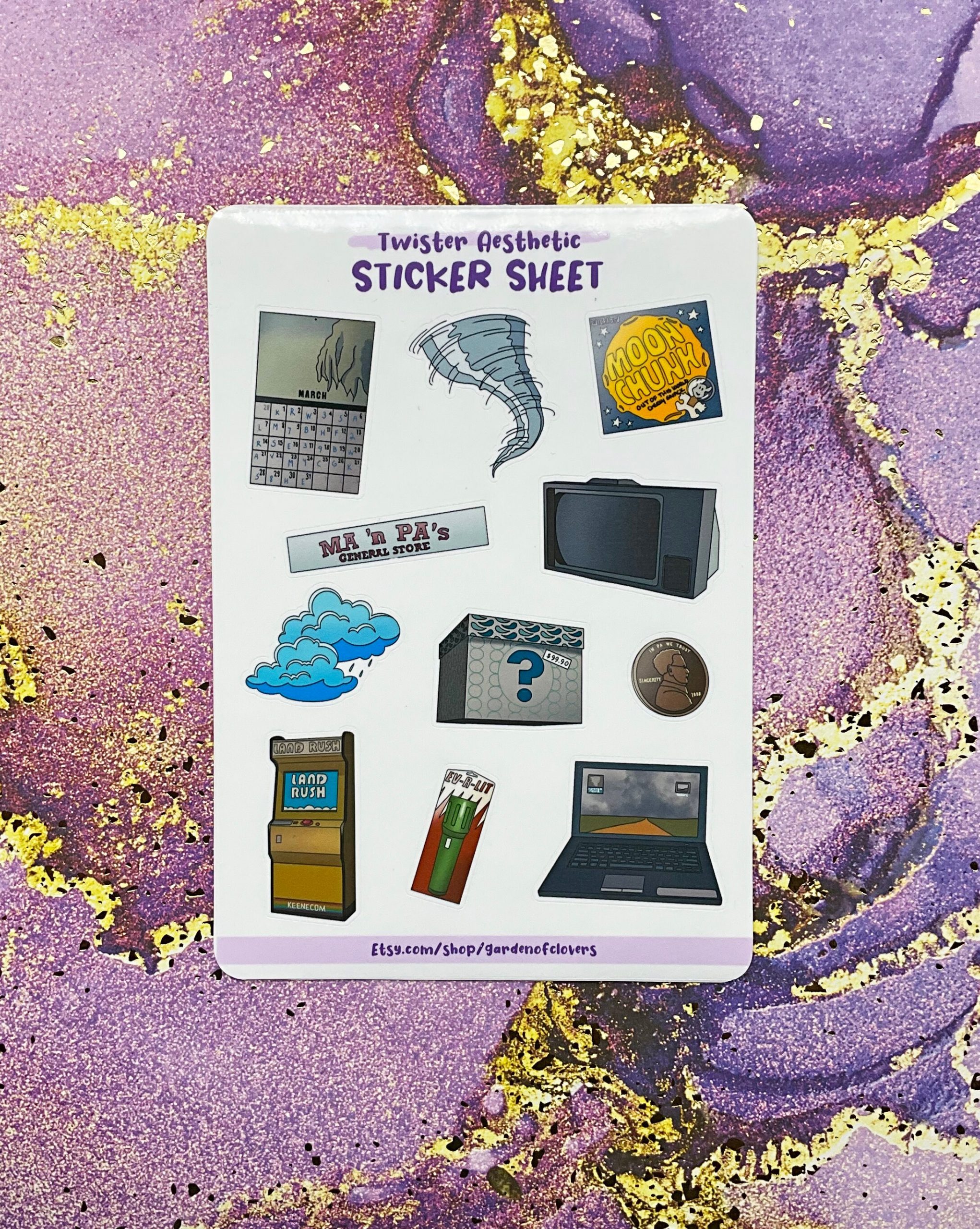 A handmade sticker sheet inspired by an old computer game featuring a mystery surrounding accidents in tornado alley. There are 11 stickers total: